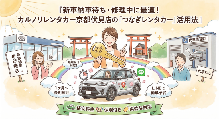 納車待ちや修理中の「つなぎ」として、カルノリレンタカー京都伏見店をぜひご活用ください。中長期の格安プランと柔軟な対応で、お客様の「困った」をしっかりサポートします!