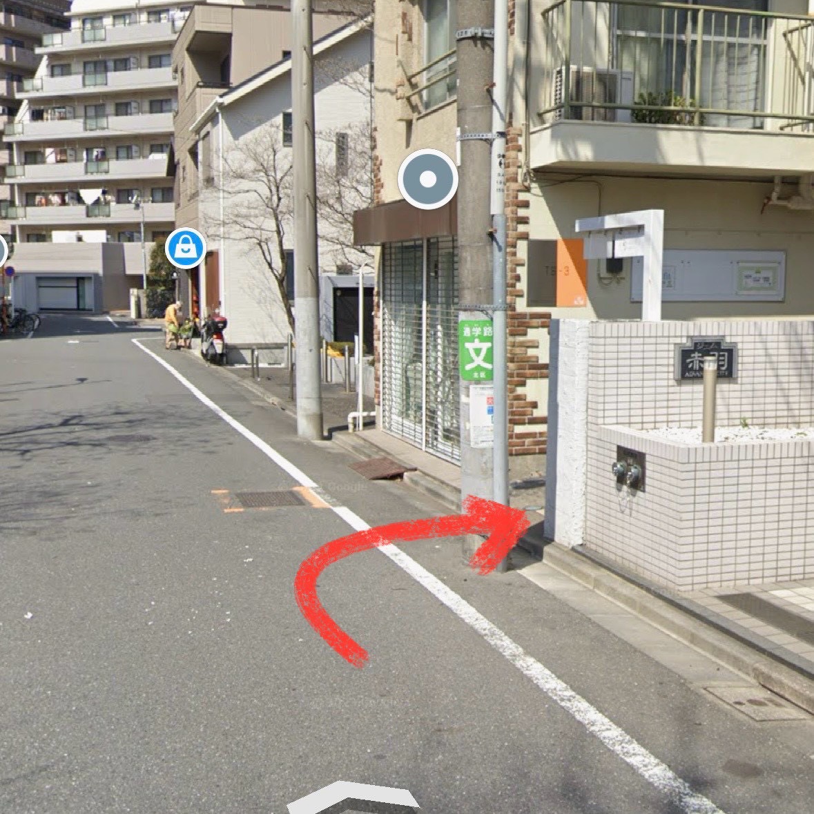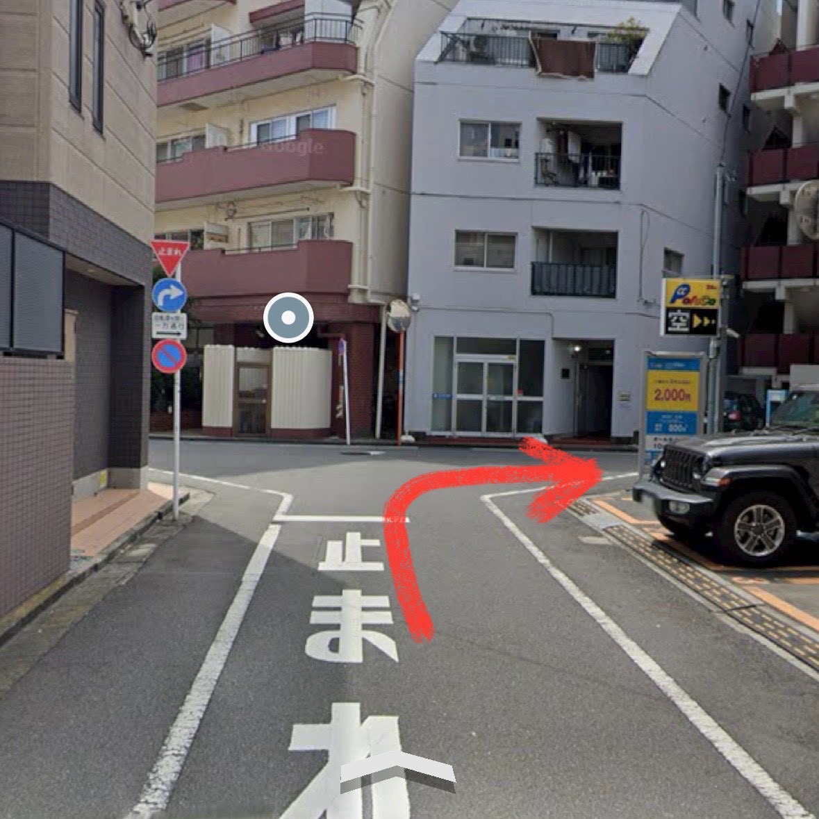 ③少し進むと最初の曲がり角が出てきますので、ここを右折します。