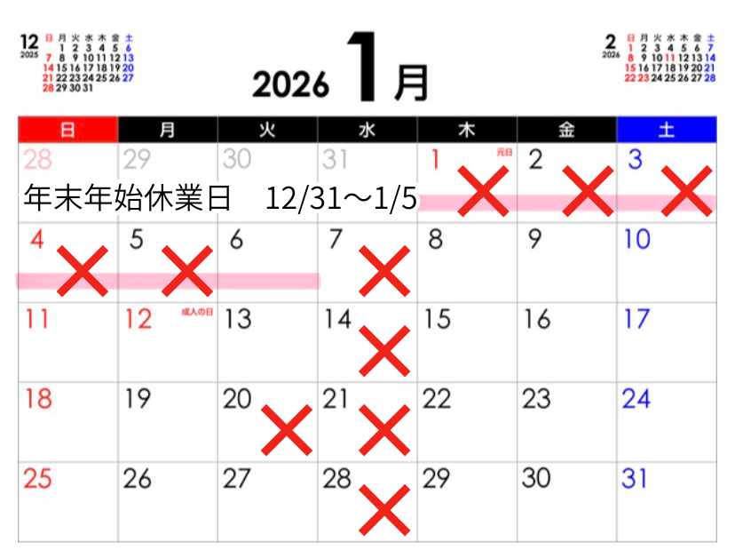 2025年12月31日(水)〜202年1月5日(月)につきましては年末年始の休業日とさせていただきますので宜しくお願いいたします。