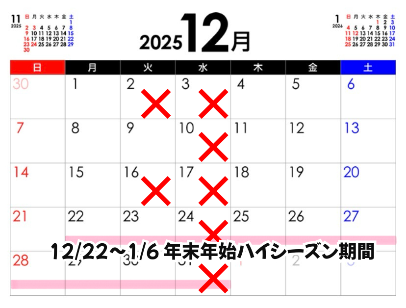 尚、2025年12月22日〜2026年1月6日の期間は年末年始のハイシーズン期間となりますので、