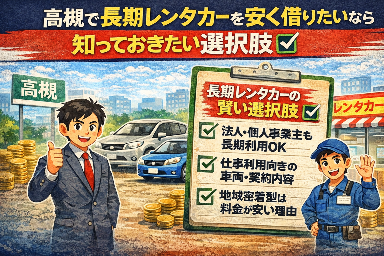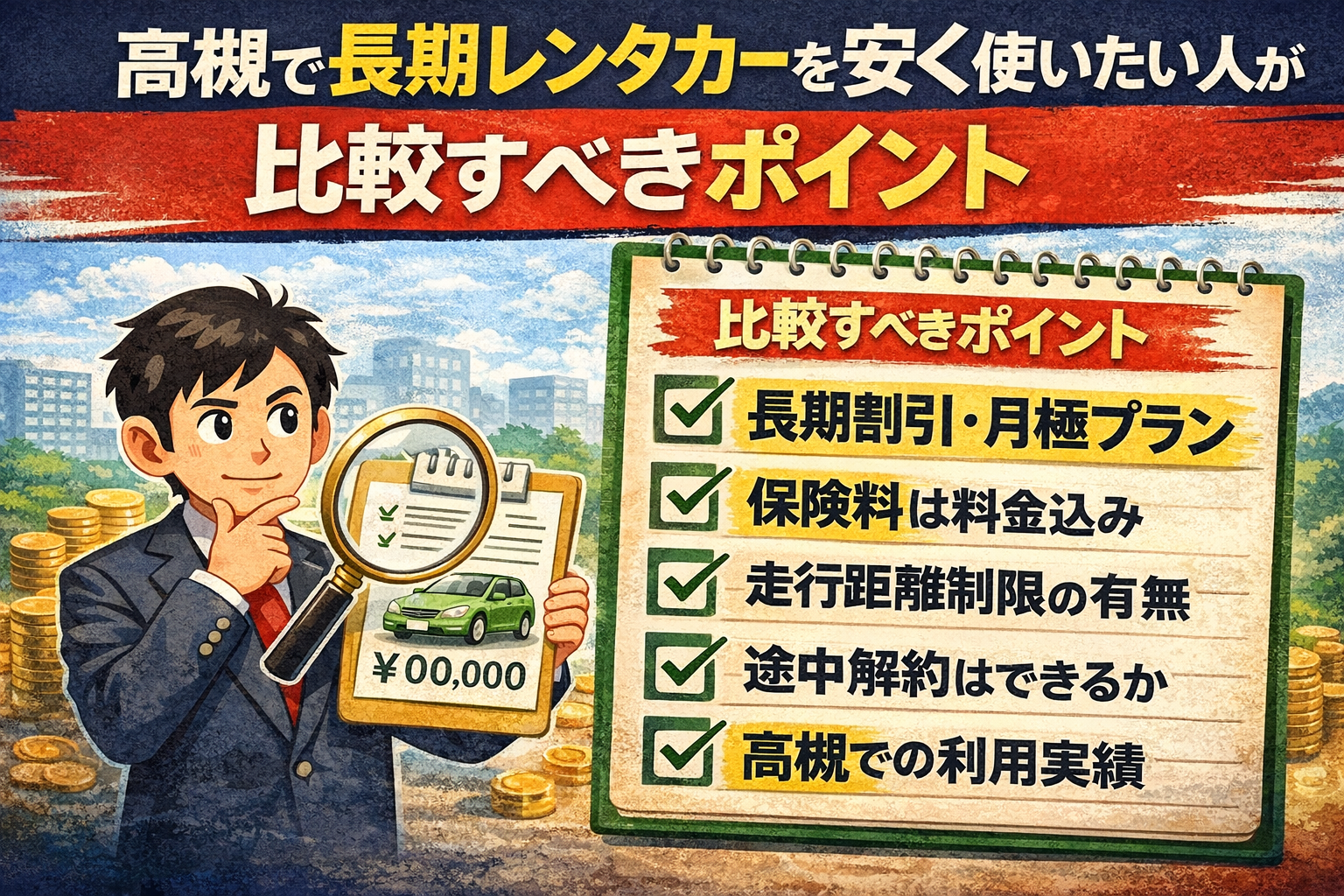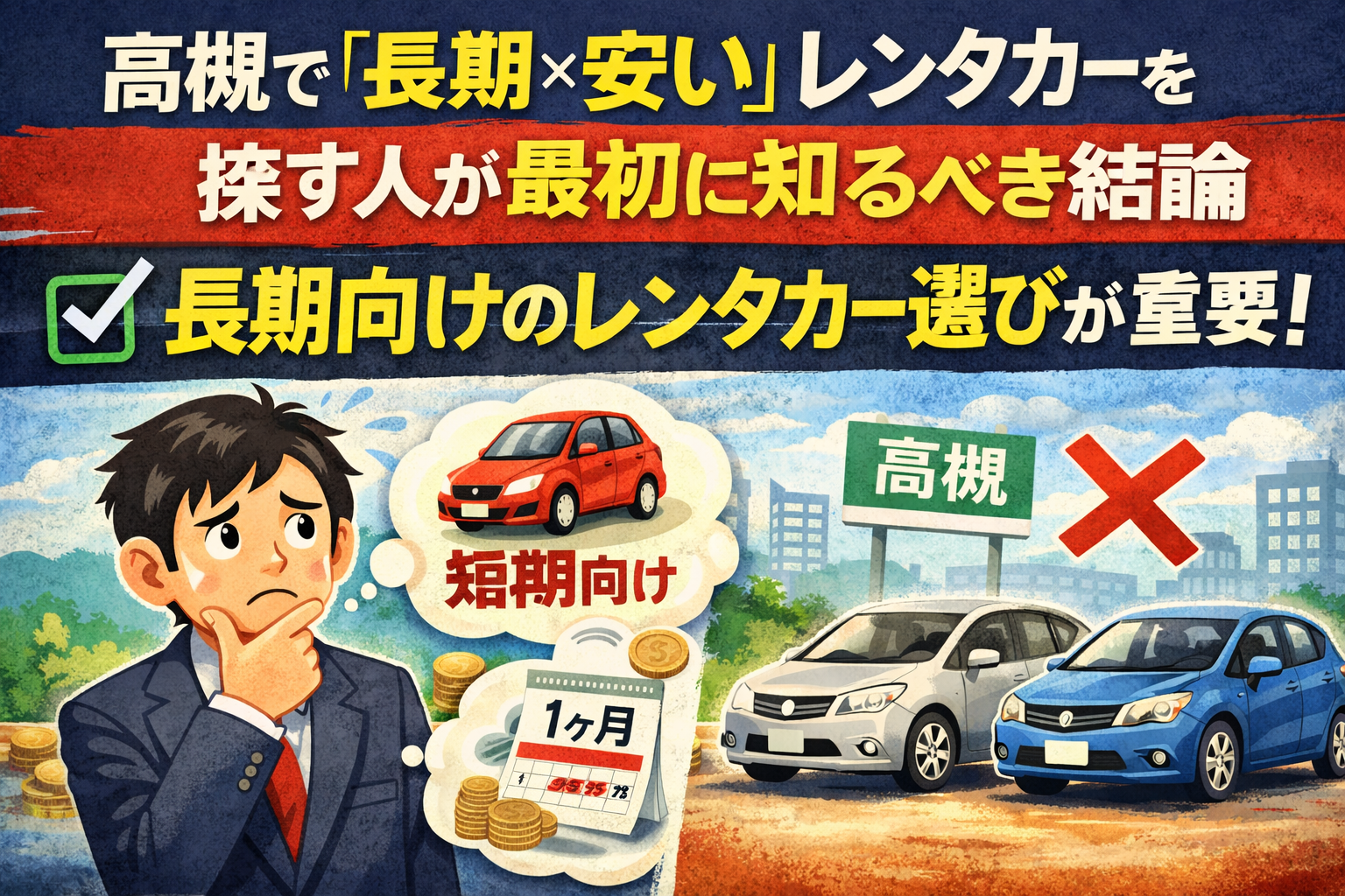 長期でレンタカーを安く使いたいなら、「安い店」ではなく「長期向けの店」を選ぶことが一番大切です。
