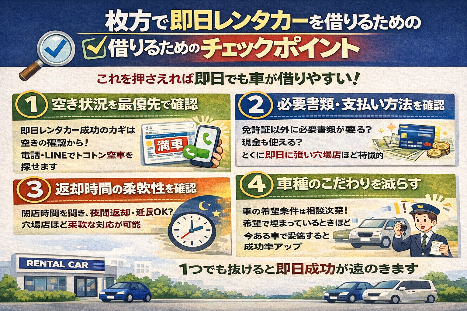 即日レンタカーを成功させるためには、難しい知識はまったく必要ありません。必要なのは「確認すべきポイントを知っているか」だけです。順番に見ていきましょう。