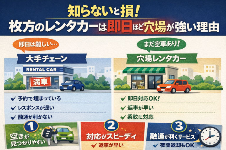枚方には、全国チェーンのように目立たないけれど、即日対応のスピード・柔軟性・空きの見つかりやすさの3つが段違いで強い“穴場レンタカー”が存在します。
