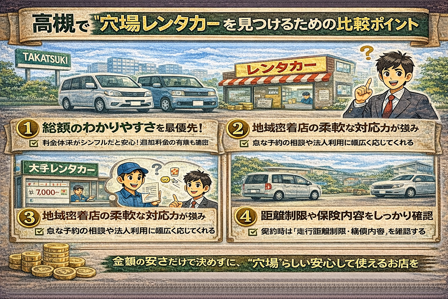 また、料金がわかりやすいことも穴場店の特徴です。基本料金に必要な補償が含まれていることが多く、わかりにくいオプションが少ないため、初めてでも安心して利用できます。