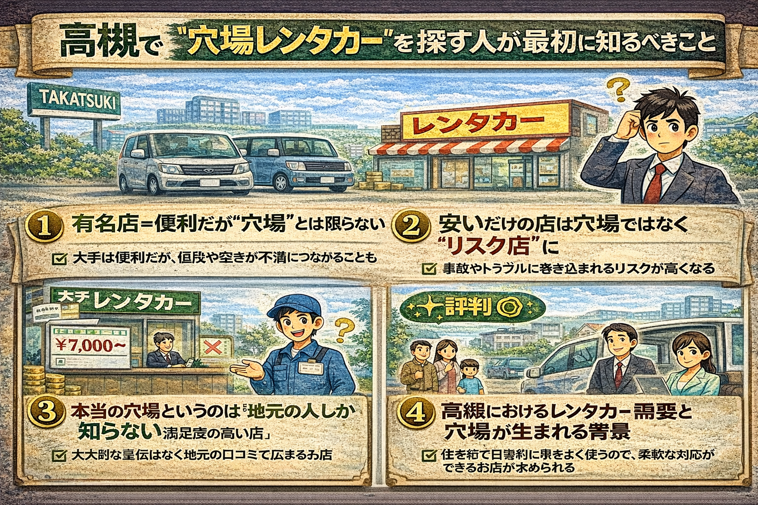 まず知っておいてほしいのは、“穴場レンタカー=怪しい店”ではないということです。穴場というのは、「派手な宣伝をしていないけれど、実際に利用した人の満足度が高い店」や「地元の人だけが知っている使いやすい店」のことを指します。高槻の場合、大手のレンタカーが駅前に集中している一方で、駅から少し離れた場所に、静かに営業している地域密着型のお店があります。