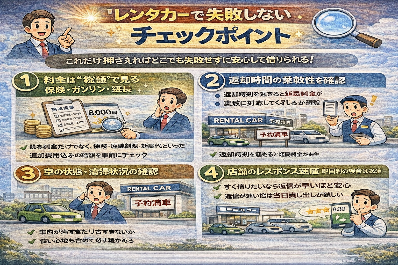 失敗を避けたいなら、“総額がわかりやすく、対応が丁寧で、柔軟に相談できる店”を選ぶのが正解です。これらを満たすのは、実は地域密着型のレンタカー店であることが多いです。