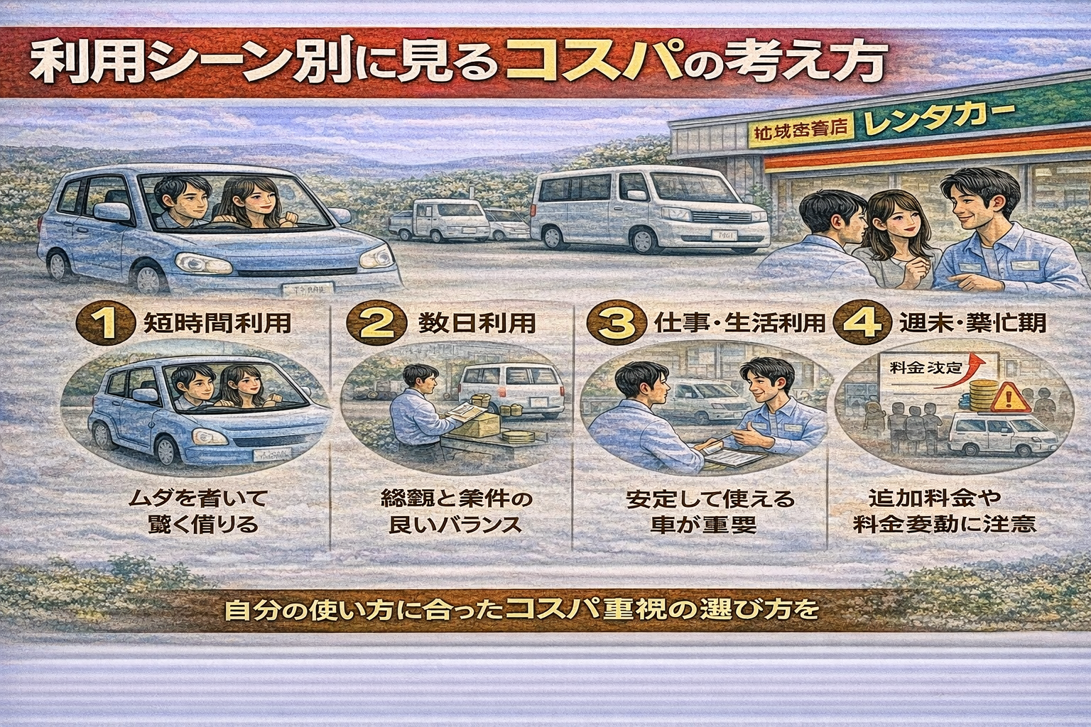 短時間利用では、無駄なオプションを付けず、必要最低限で借りられるかがコスパの分かれ目です。一方、数日以上の利用になると、日額の安さよりも総額と条件のバランスが重要になります。