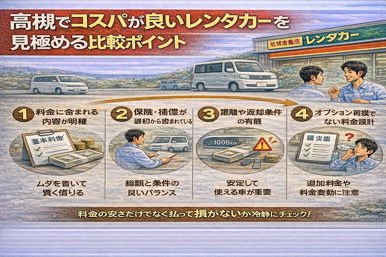 レンタカーのコスパは「安さ」ではなく「納得感」で決まります。表示されている料金が安くても、保険や補償が別料金だったり、距離制限が厳しかったりすると、最終的な支払額が大きく膨らむことがあります。