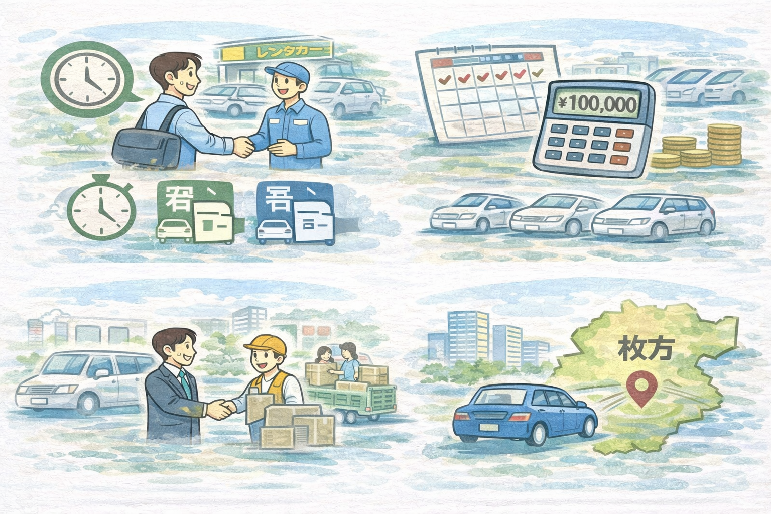枚方は通勤・業務・生活利用が混在する地域のため、走行距離が伸びやすく、返却時間や利用条件の柔軟さが重要になります。「安い日額」ではなく、「使い続けたときに無理がないか」という視点が欠かせません。