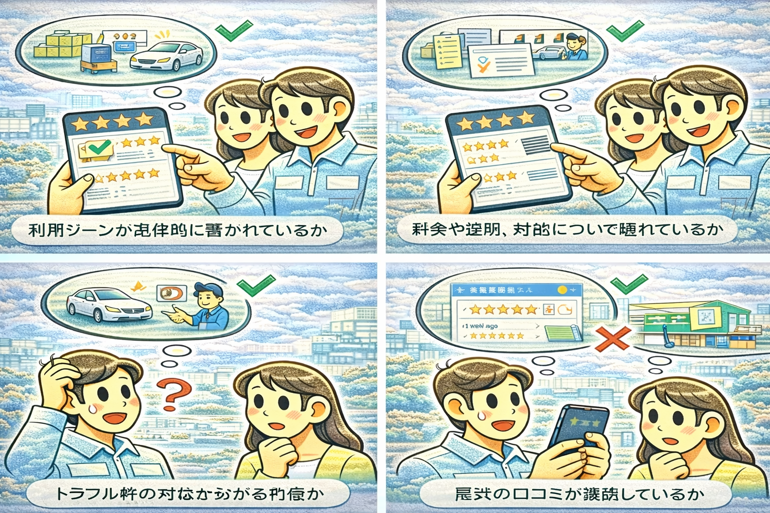 高槻の口コミが判断しにくい最大の理由は、利用シーンの多様さにあります。短時間利用、営業用途、引っ越し、家族利用など、前提条件が大きく異なるため、同じ店舗でも評価が割れやすくなります。また、「安かった」「親切だった」といった感想中心の口コミが多く、具体的な条件や背景が書かれていないことも少なくありません。さらに、古い口コミが残りやすく、現在の料金体系や対応と一致しない場合もあり、比較を難しくしています。
