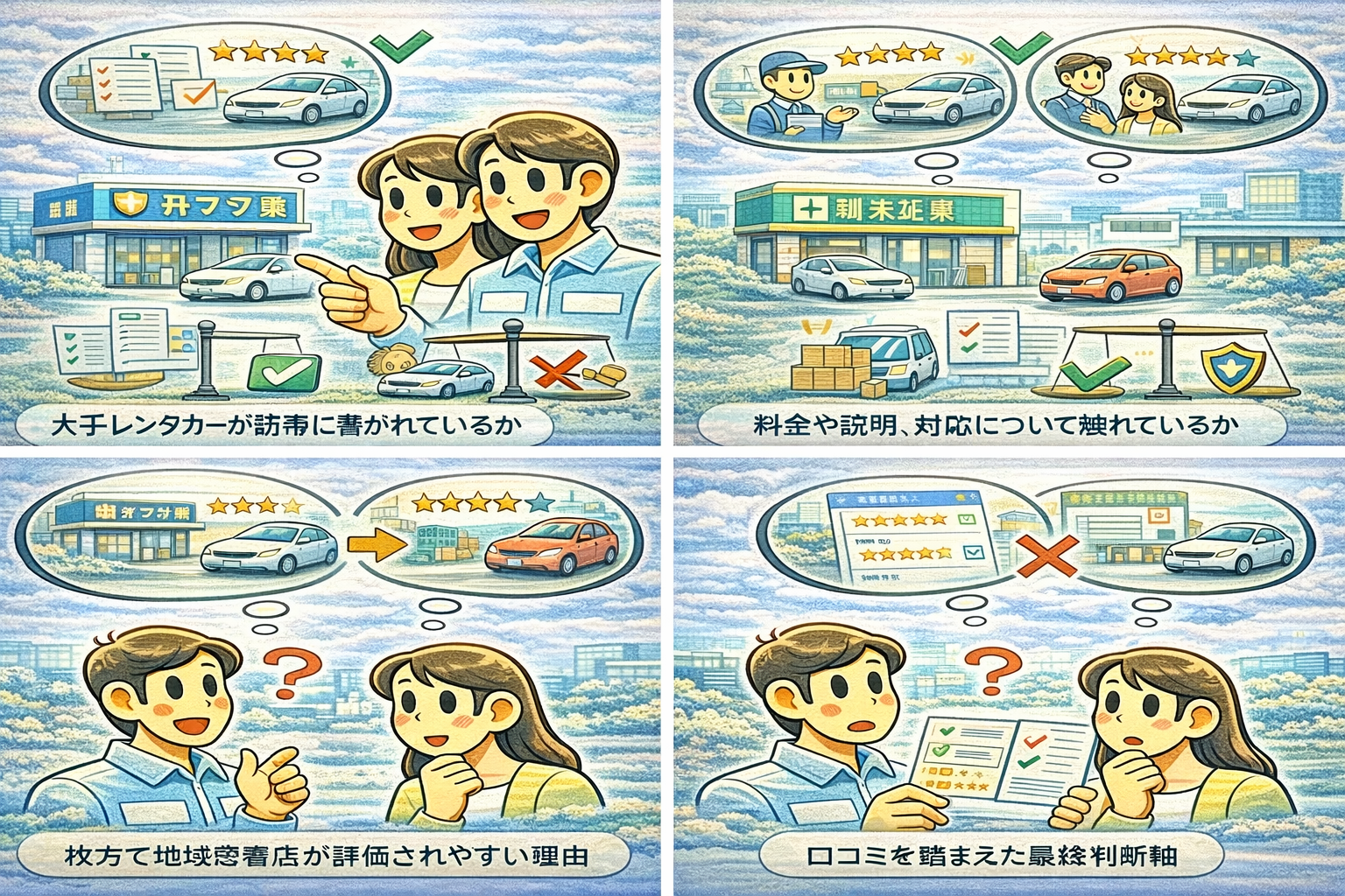 高槻でレンタカーを探すとき、多くの人が最初に確認するのが口コミや評判です。しかし、口コミを丁寧に見たつもりでも「想像と違った」「自分には合わなかった」と感じるケースは少なくありません。高槻は利用目的が幅広い地域だからこそ、口コミの読み方を誤ると判断を誤りやすくなります。ここでは、口コミが分かりにくくなる理由と、失敗しにくい見極め方を整理します。