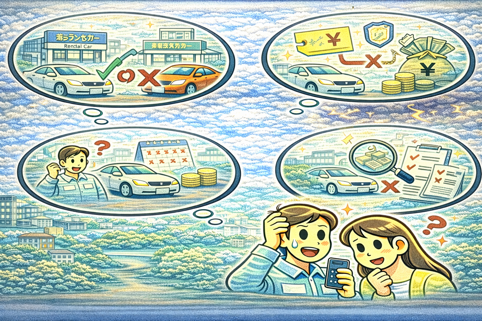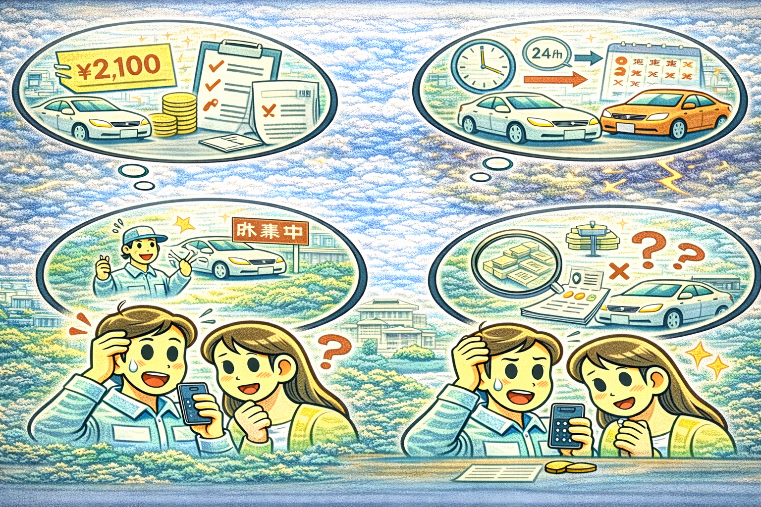 また、「大手だから安心」「口コミが良いから大丈夫」と判断し、利用条件や制限を深く確認しないまま借りてしまう失敗も多く見られます。利用目的と車両・契約内容が合っていない場合、使いにくさや追加負担につながりやすくなります。