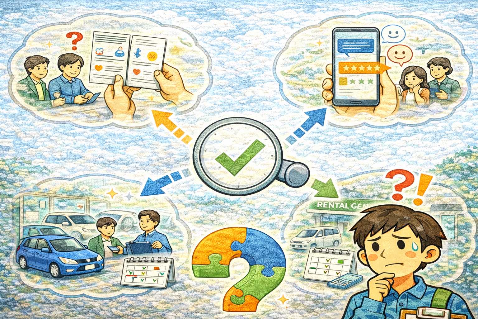 補償内容は必ず確認します。万が一の事故対応に差が出るからです。また、営業時間や返却ルールも事前に把握しておくと安心です。