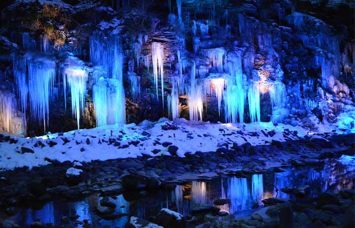 自然の寒さを生かして作られた氷柱は迫力があり、昼に見る姿と、夜のライトアップではまったく違う雰囲気を楽しめます。