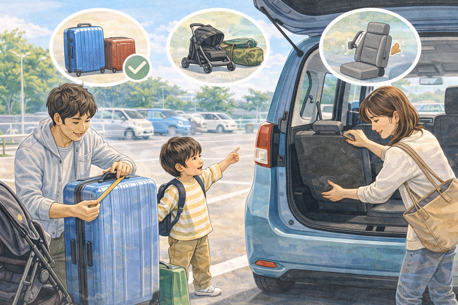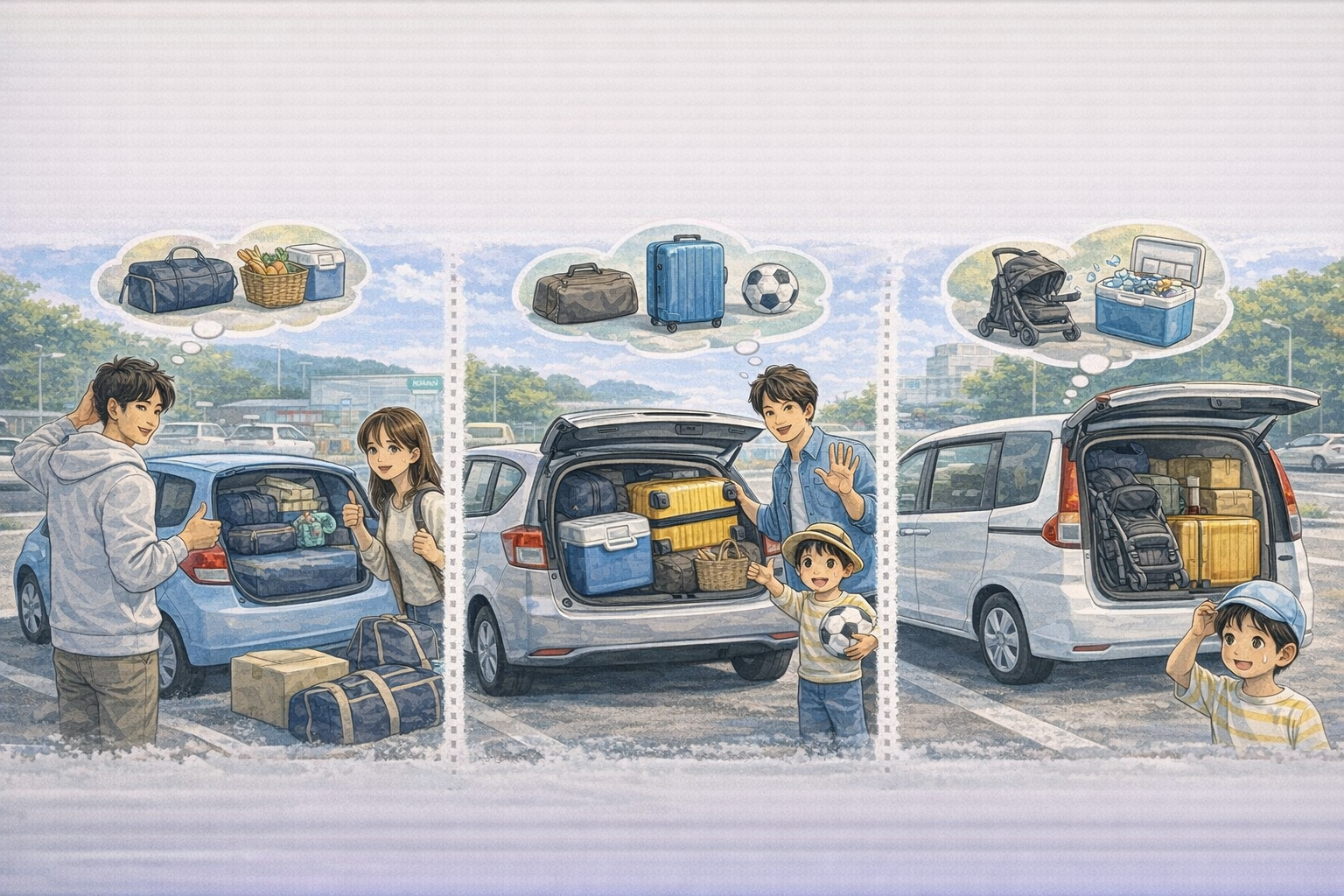 スーツケース、ベビーカー、クーラーボックス、まとめ買いの段ボール。これらは想像以上にスペースを使います。トランク容量の数字だけを見ても、実際の高さや奥行きをイメージできていないと失敗につながります。