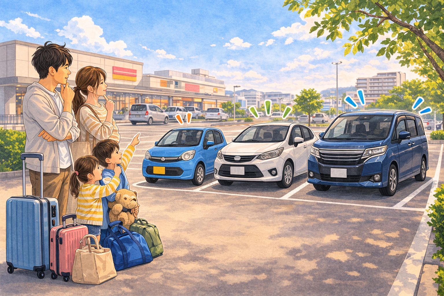 コンパクトカーは、3〜4人+中型スーツケース数個程度ならバランスが良い選択です。運転しやすさと積載量の両立が可能です。