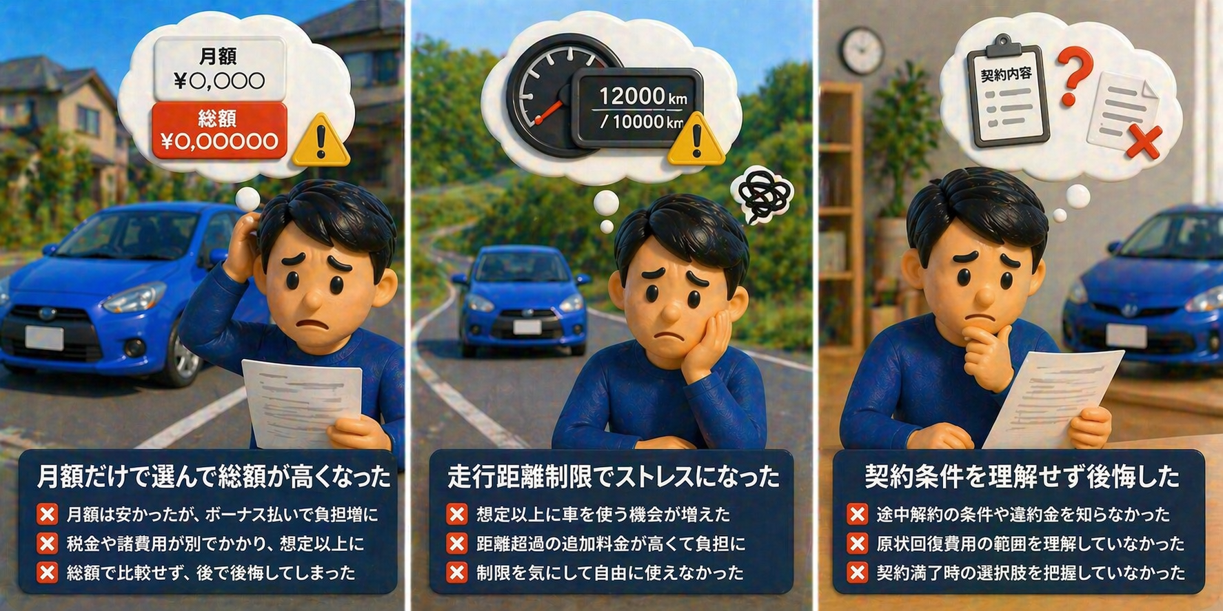 一方で、カーリースで後悔している人にも明確なパターンがあります。