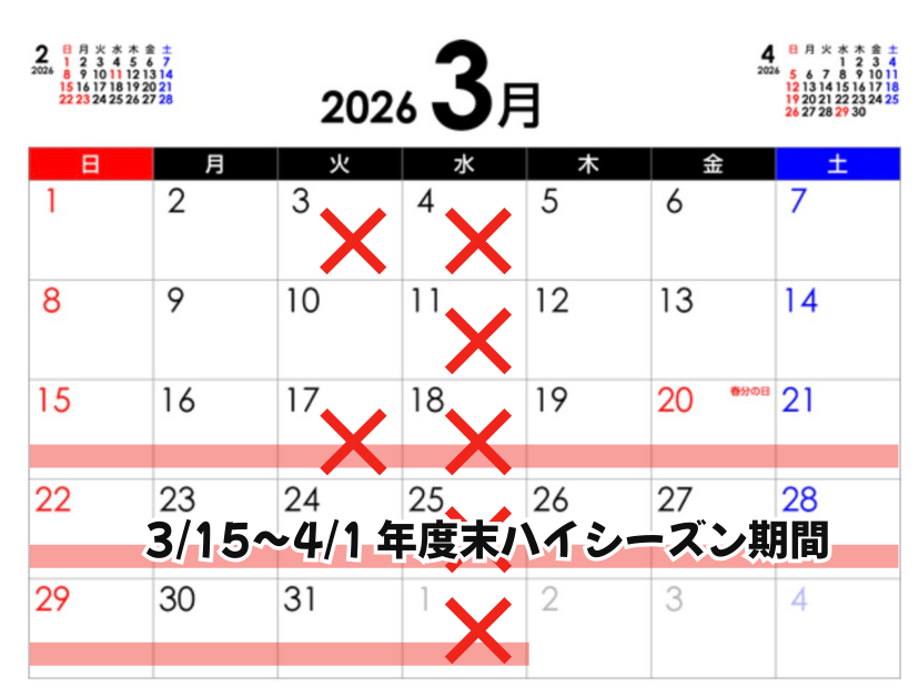 尚、3月15日〜4月1日はハイシーズン期間となりハイシーズン料が発生いたします。
