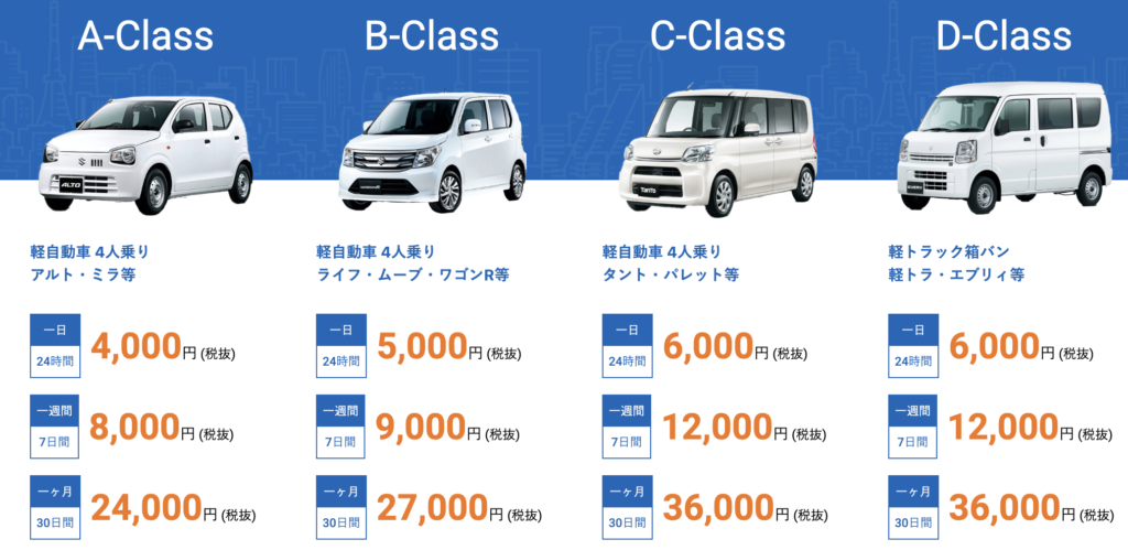Aクラスの場合、1日(24時間)利用で4,000円となります。