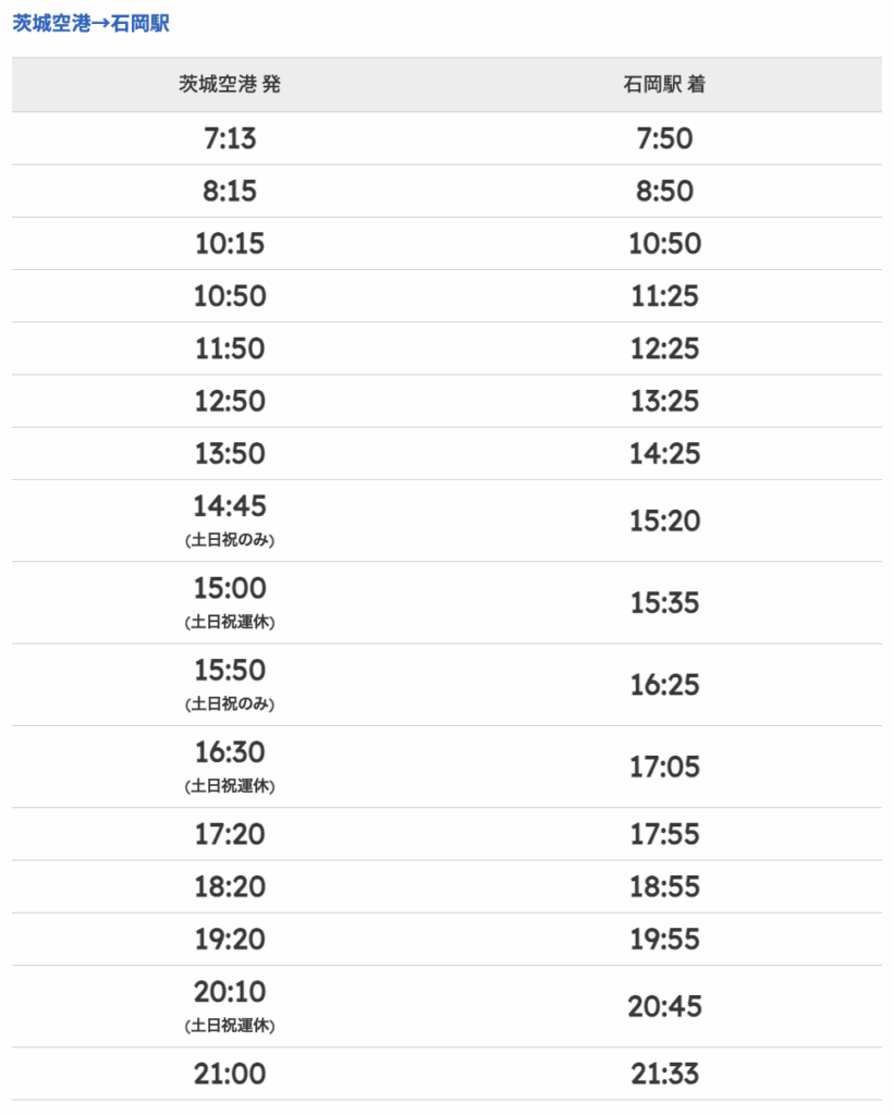 茨城空港から石岡駅までのバスの時刻表などは茨城空港公式HP、もしくはNAVITIMEなどをご参照ください。