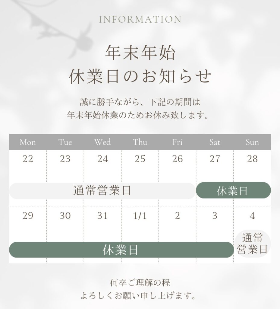 年末年始のご予約に関するお問い合わせが増えてきましたので、 休業期間についてご案内いたします。