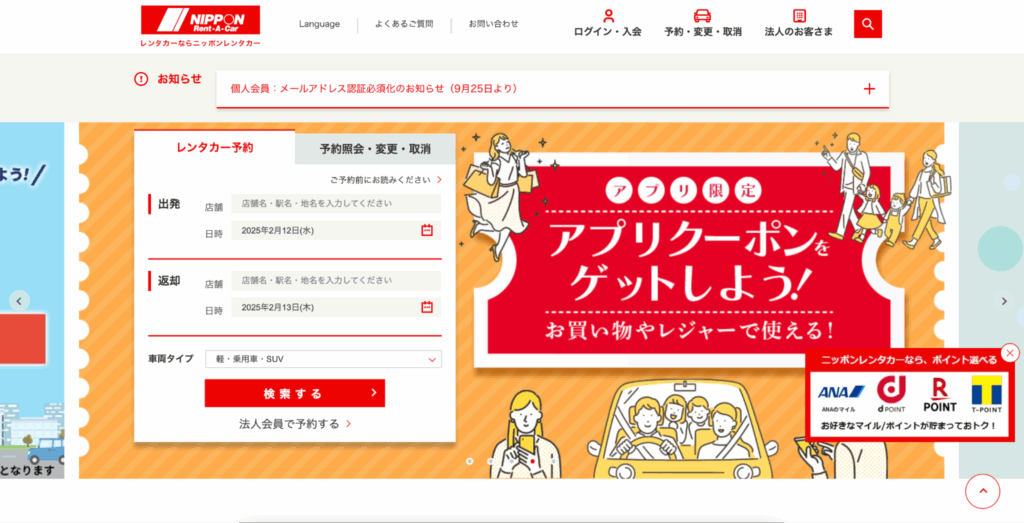 ニッポンレンタカーは、快適でスムーズな手続きを重視する方におすすめのレンタカー会社です。当日のカウンターでの受付を省略できるアプリチェックインは、時間を節約したい人には便利な機能です。