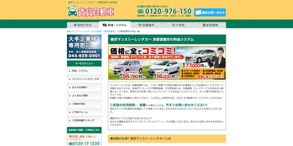 ウィークリーは1週間22,000円〜、マンスリーは1ヶ月85,800円〜と、短期から長期まで明確な料金設定が用意されています。伏見区で信頼性と店舗数を重視したマンスリーレンタカーを探す方に向いているでしょう。