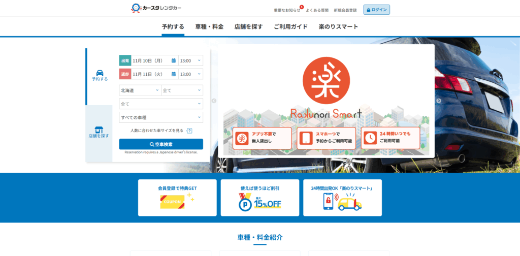 カルノリレンタカーはウィークリー・マンスリー専門の格安レンタカー店です。