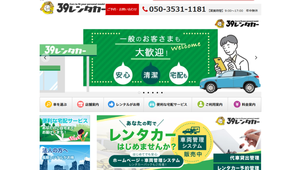 | 取扱車種 | 軽自動車(4人乗り) コンパクトカー(4〜5人乗り) ファミリーカー(7〜8人乗り) ワゴン(10人乗り) 軽トラック・商用バンなど |