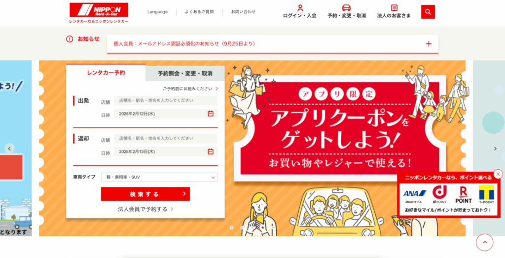 公式サイトやアプリから会員登録をすれば、レンタカー料金が最大で10%オフにできます。レンタカーを借りることで、ANAマイルや楽天ポイントを貯められるので、旅行で利用する時はお得なレンタカー会社です。