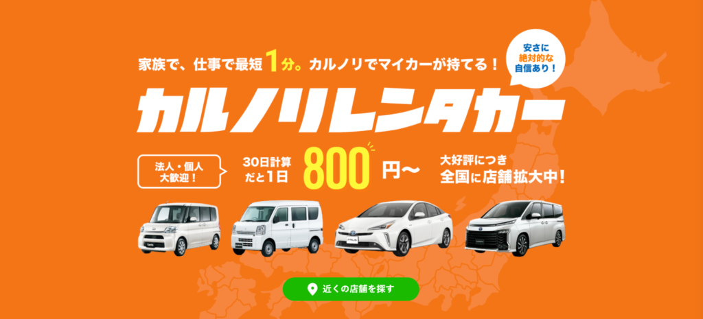 カルノリレンタカーは、全国に店舗展開を広げている格安レンタカー会社です。1日単位の利用だけでなく、1週間や1ヶ月といった中長期プランに特化しているのが特徴です。