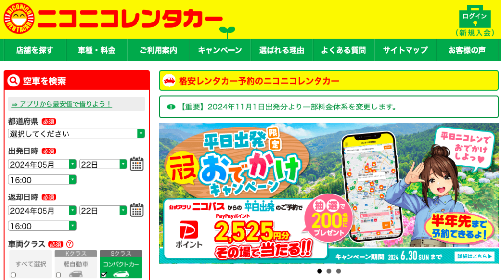 ニコニコレンタカーは格安料金が最大の魅力で、公式アプリ「ニコパス」を利用すればさらに最大20%割引となります。全国47都道府県に店舗を展開し、全車ETC標準搭載で利便性も抜群です。