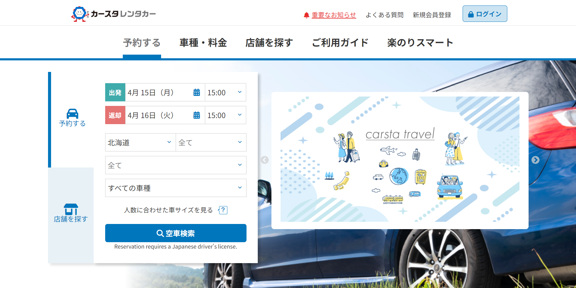 カルノリレンタカーはウィークリー・マンスリー専門の格安レンタカー店です。