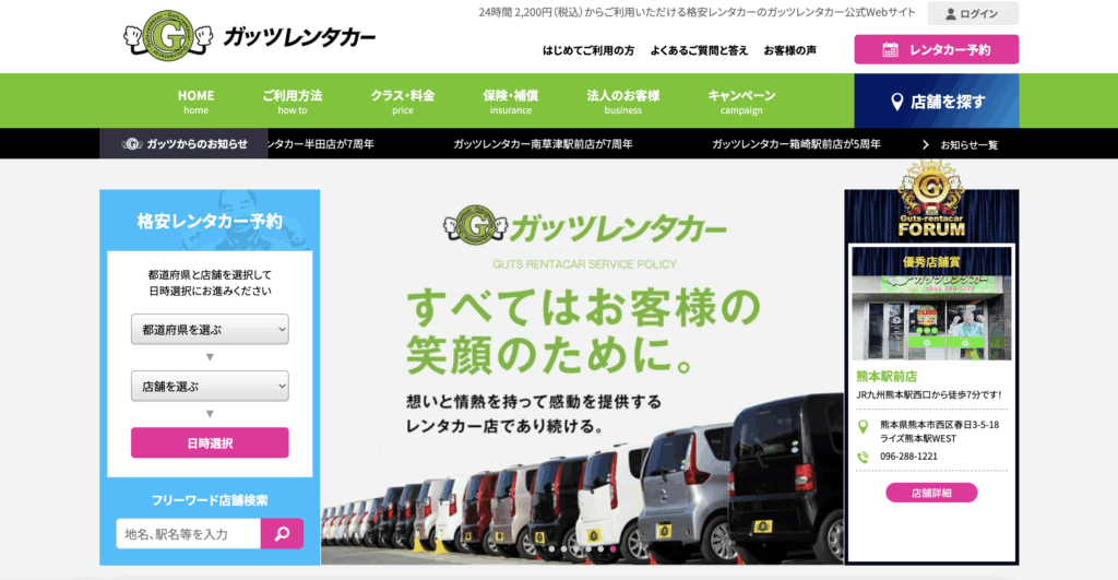 短期から長期まで格安でレンタルできるガッツレンタカーは、出張やマイカーの代車が必要な時にも最適です。