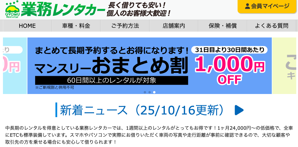 カルノリレンタカーはウィークリー・マンスリー専門の格安レンタカー店です。