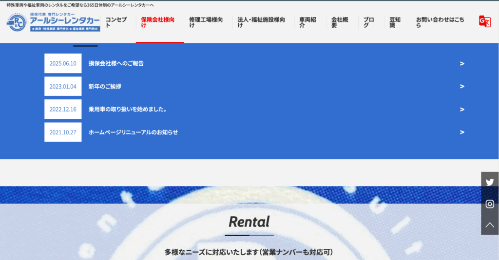 | 取扱車種 | 軽・乗用車:4~5人乗り SUV:5人乗り ミニバン・ワンボックスワゴン:5〜10人乗り バン・トラック:2〜3人乗り バス・福祉車両:2〜29人乗り |