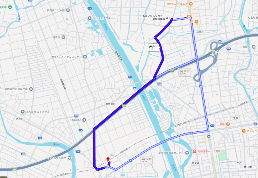 カルノリレンタカー愛知津島店は、永和駅から車で約6分の場所にあります。