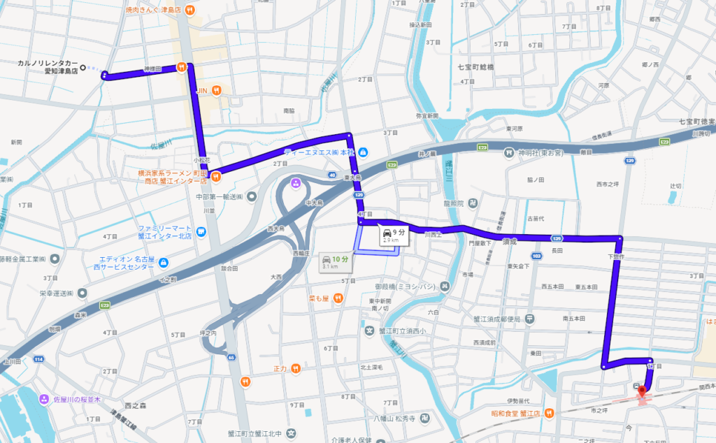 カルノリレンタカー愛知津島店は、蟹江駅から車で約9分の場所にあります。