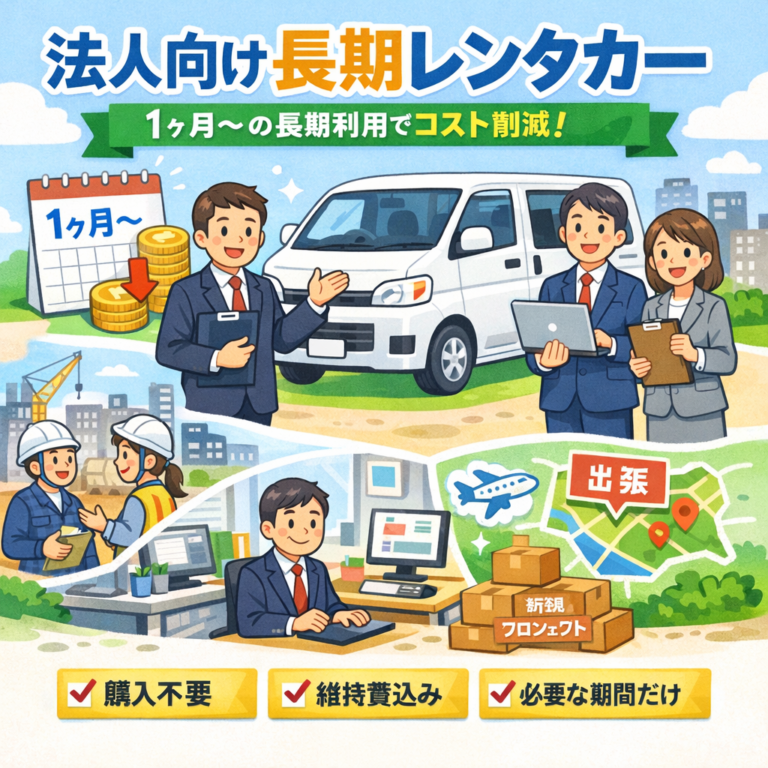 社用車の代わりに|法人向け長期レンタカーという選択 「社用車を購入するか迷っている」「一定期間だけ車が必要」 このような企業様に選ばれているのが、法人向け長期レンタカーです。 車を購入すると初期費用がかかるだけでなく、保険や車検、税金などの維持費も継続的に発生します。一方、長期レンタカーであれば必要な期間だけ車を利用できるため、コスト管理がしやすくなります。 この記事では、法人様が長期レンタカーを […]