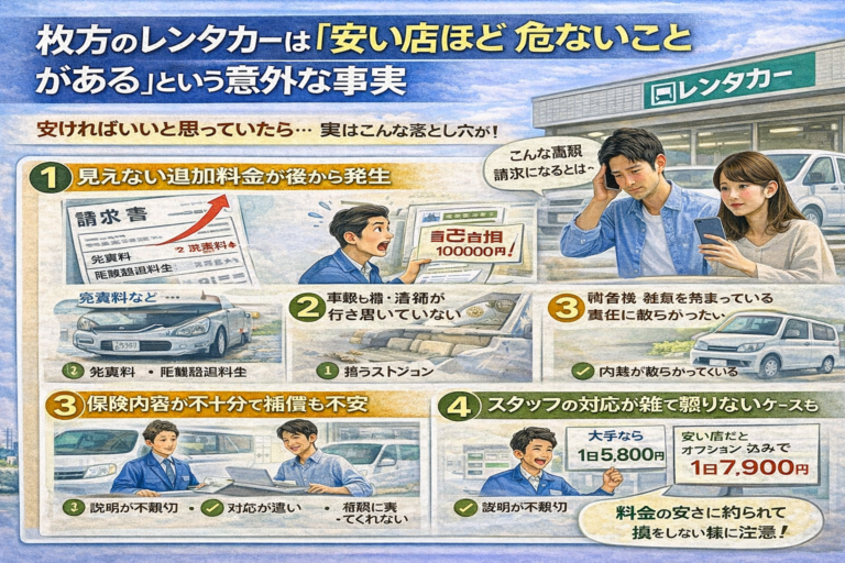 枚方でレンタカーを借りようとした際、 「料金が思ったより高かった」 「返却時に追加請求が発生した」 「車が汚れていて不安になった」 などのトラブルは、意外と多く耳にする内容です。特に枚方は大手店舗が限定的で、繁忙期は早い段階で満車になりやすいため、焦って選んでしまい後悔するケースが少なくありません。 本記事では、枚方でよく起こりやすいレンタカートラブルの実例と、避けるためのポイント、そして安心して […]